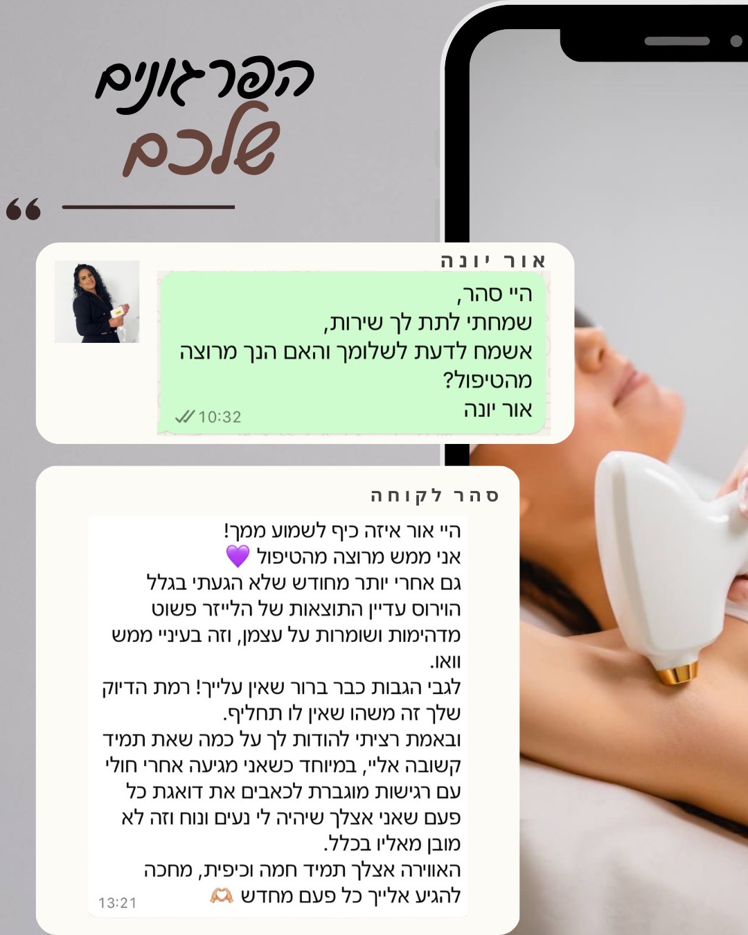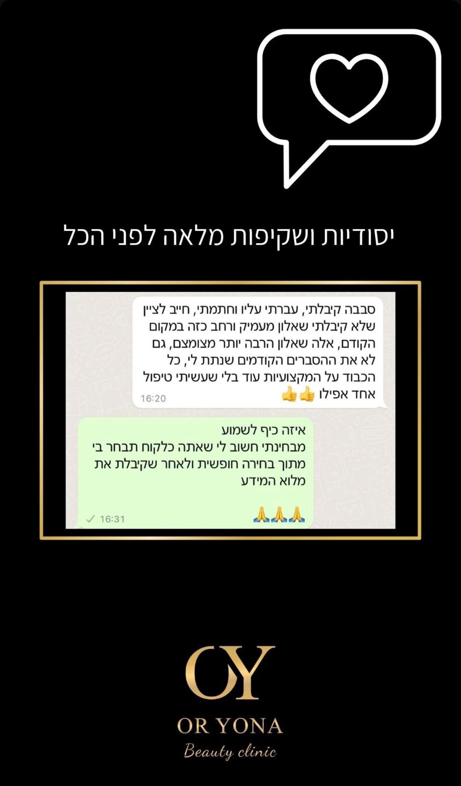 בקליניקה של אור יונה תיהנו ממגוון טיפולים קוסמטיים ואסתטיים ברמה הגבוהה ביותר – כל טיפול מותאם אישית, באהבה, ומקצועיות.